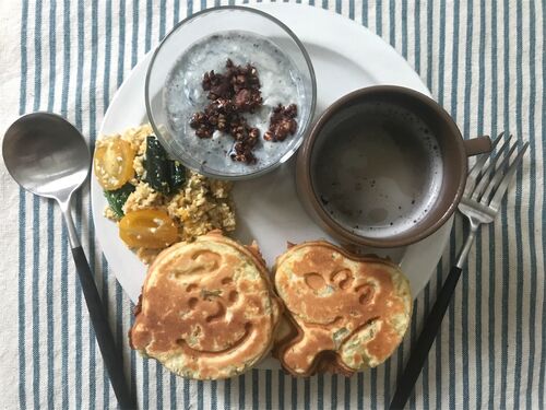 today's breakfast* さつまいもと米粉と甘酒のパンケーキ ヴィーガンスクランブルエッグ マッシュルームのスープ 麻炭豆乳ヨーグルト いつも固まらなかったり 分離しすぎたりする麻炭ヨーグルト 今回はコンブチャをスターターにしたら 1日でしっかり固まっ…
